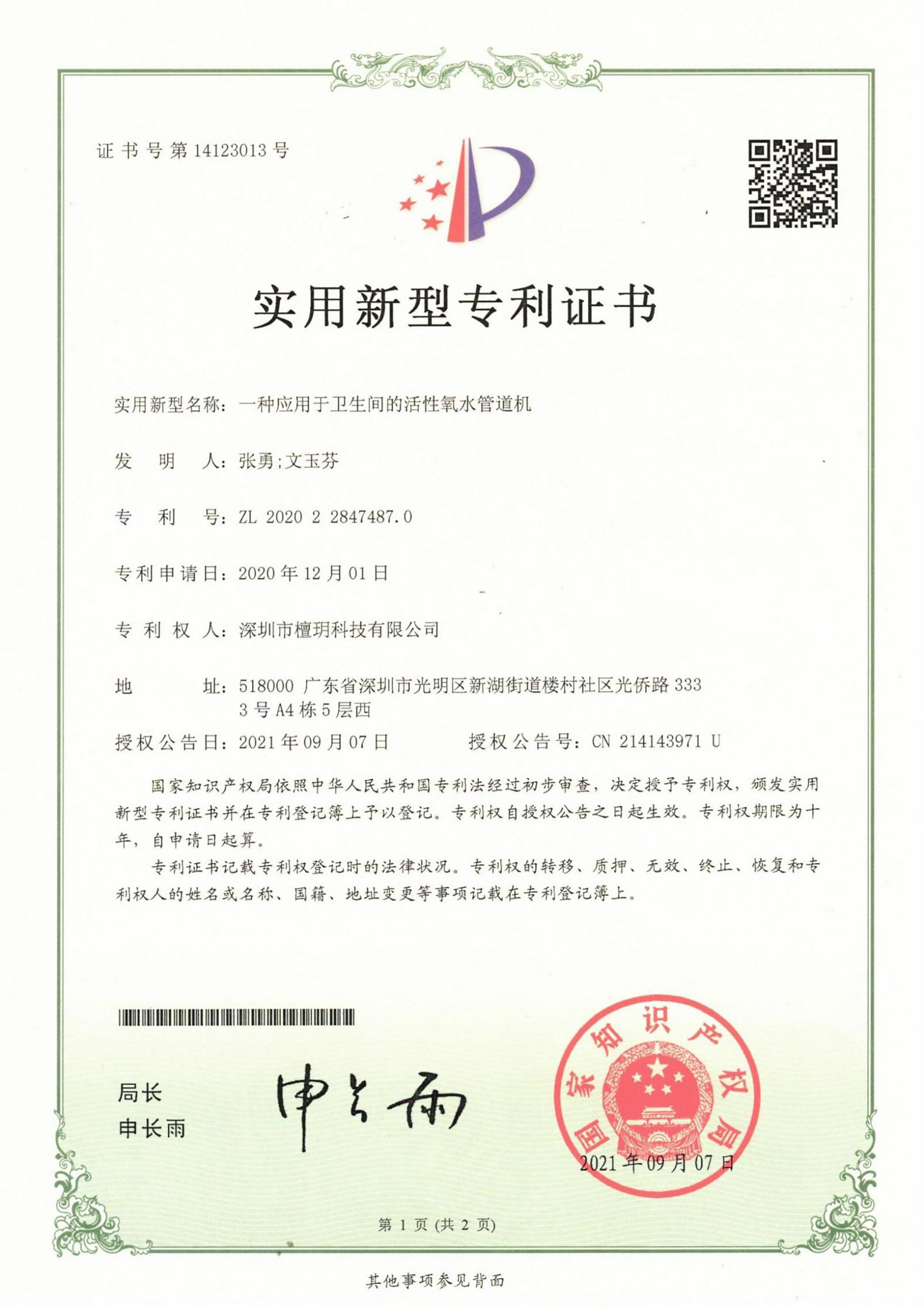 实用新型专利证书_一种应用于卫生间的活性氧水管道机
