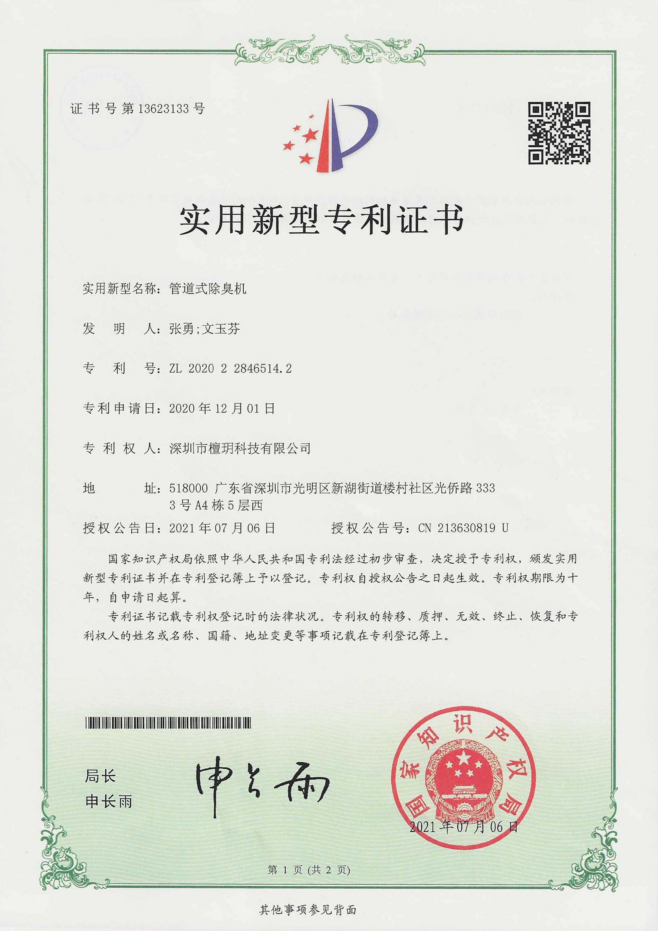 实用新型专利证书-管道式除臭机